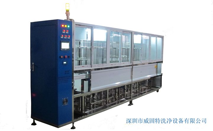 VGT-1409FT為離心甩干式光學超聲波清洗系統(tǒng),共有14個功能槽,配置有循環(huán)過濾系統(tǒng)、有機溶劑蒸餾回收系統(tǒng)、自動恒溫系統(tǒng)、拋動系統(tǒng)、超聲波清洗系統(tǒng)、抽風系統(tǒng)、降噪系統(tǒng)、FFU系統(tǒng)、純水系統(tǒng)、離心甩干系統(tǒng)等。設備采用環(huán)保型有機溶劑洗滌、水溶劑洗滌、純水漂洗,為環(huán)保型清洗機;