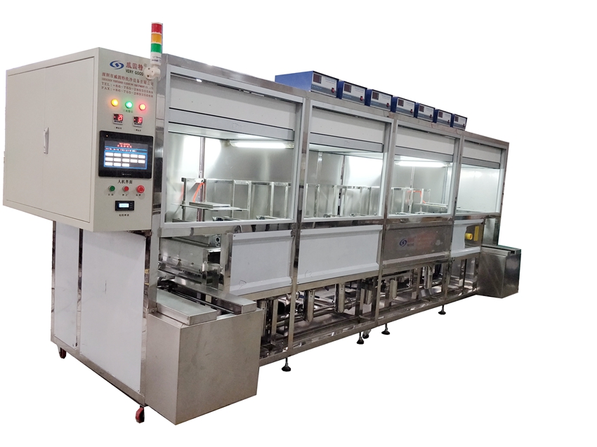 VGT-907FS立方基準棱鏡超聲波清洗機將裝有產品的洗籃放置自動入料臺上,由PLC 控制進料系統定位再通過提升機構、平移機構的配合龍門機械手依次送入各工序段,對工件進行各工序段的清洗、漂洗、脫水、干燥完成后,通過傳動,自動將洗籃送出,人工卸下洗籃,即完成整個清洗過程。