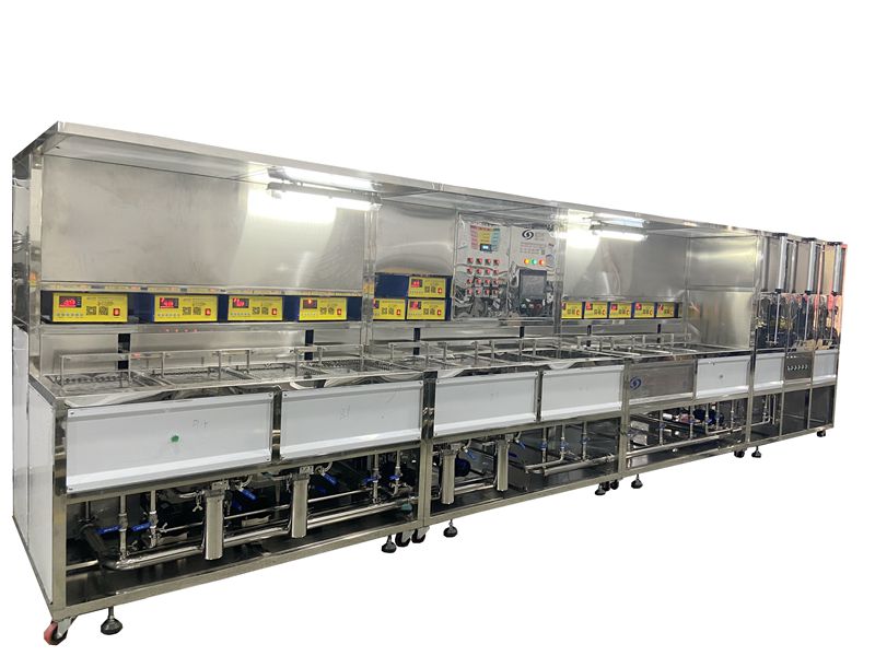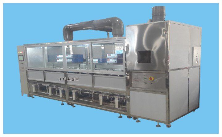 威固特VGT-609FTA超聲波清洗機,設備共有6個功能槽,配置有循環過濾系統(袋式過濾系統)、觸摸屏系統、拋動系統、超聲波清洗系統、對流清洗系統、自動智能式撥桿機械手系統、風切系統等。