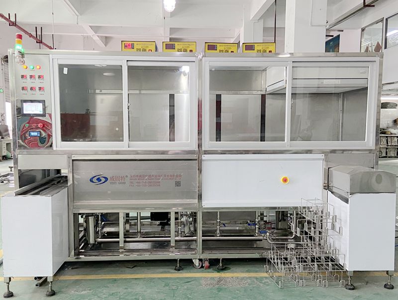 VGT-907FS立方基準棱鏡超聲波清洗機將裝有產品的洗籃放置自動入料臺上,由PLC 控制進料系統定位再通過提升機構、平移機構的配合龍門機械手依次送入各工序段,對工件進行各工序段的清洗、漂洗、脫水、干燥完成后,通過傳動,自動將洗籃送出,人工卸下洗籃,即完成整個清洗過程。