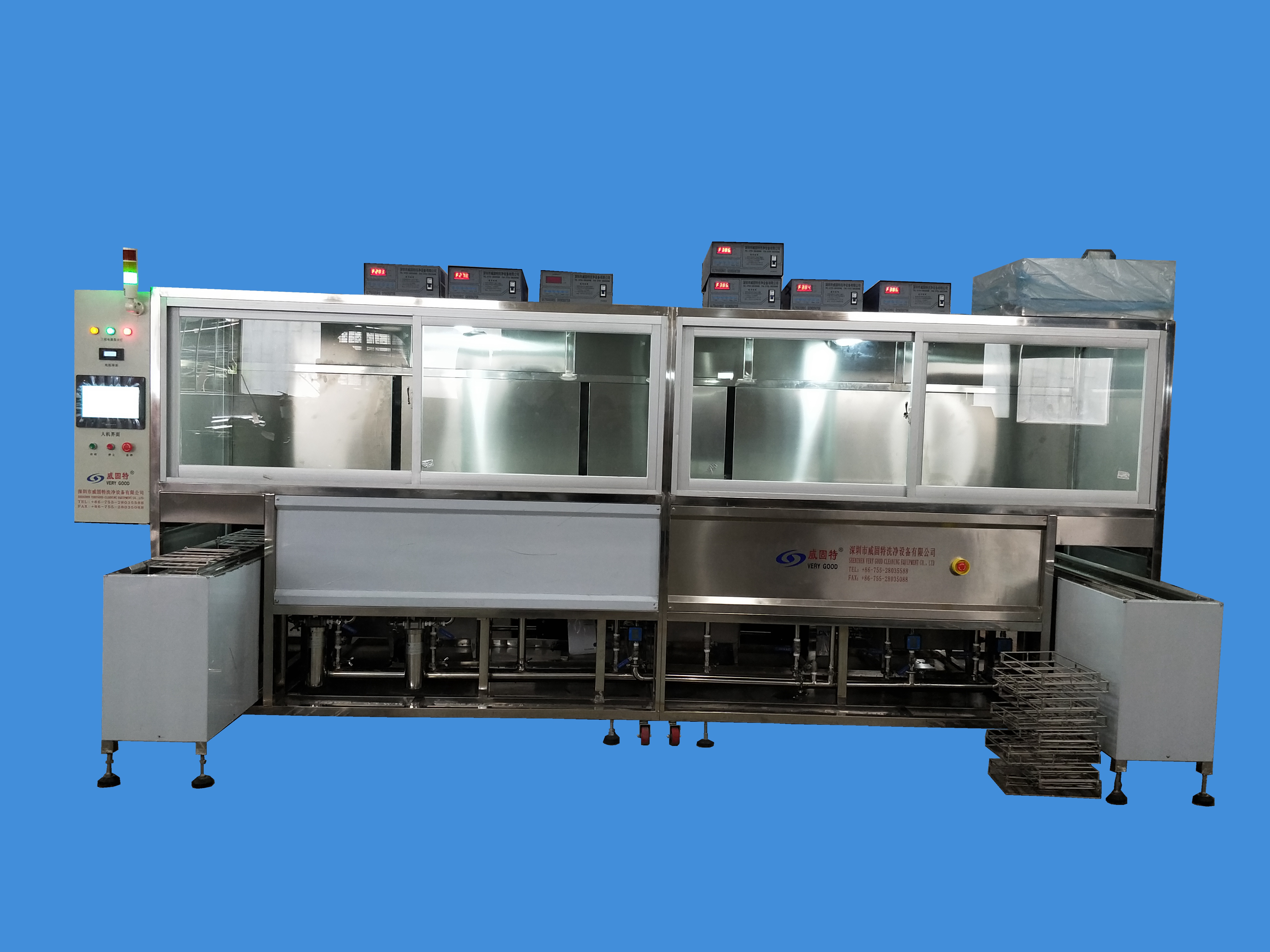 威固特超聲波清洗機廠家IR-CUT雙濾鏡光學超聲波清洗機IR-CUT雙濾鏡光學超聲波清洗機的清洗過程是操作者將裝有工件的洗籃放在進料臺上,自動進料臺將洗籃送入上料位,由PLC控制機械臂依次送入各工段。